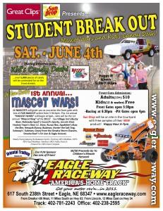 -RELAX…as Great Clips presents “Student Break Out Night!” -Sun Drop will be on site in the Courtyard with Free samples of their NEW product from 5:30-6:30pm! -All MASCOTS will greet you as you enter the front gate with lots of FUN MASCOT action from 5:30-6pm -The 1st annual "MASCOT WARS" will begin at 6pm...who will be the 1st annual "Mascot King" of the 2011 MASCOT WARS? See Village Inn’s Bucky Bear, Applebee’s Buzz the Bee, Nebraska Sports Council’s Sporty, Lincoln Starz Hockey Team’s Own I.C. Starz, Runza Rex, Nesquik Bunny, Budman, Homer the Salt Dog, Subway’s Subman, Casey from the Omaha Storm Chasers, Sir Lion from the Omaha Beef and Eagle Kneivel -Happy D Klown from 5:30-7:30pm -Rocket Fizz Kid's Candy Dash during intermission...over 5,000 pieces of candy will be contended for on the front stretch! …only at Eagle Raceway...America's Home Track!