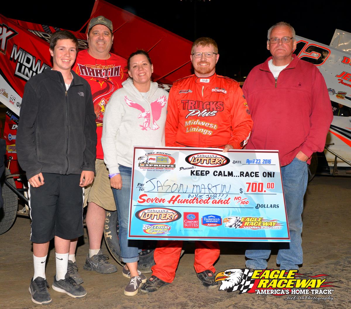 Leiting had started in the third spot. “We went 3-wide at times. I knew I had to protect the bottom, and I was really worried about Lance once I got the lead and he got to second. It’s nice to come out and win the opener, because I can’t be here every week due to other commitments. I want to than all of the veterans for all they did for us” he related. Leiting’s sponsors include MDI Custom Homes, Traditions Pub, KVC Foster Care, Ben Bleicher Home Realty, Roca Tavern. K2L Graphics, Goldfuss Racing and Fabrication, Williams Welding, Terry’s Electric, People’s Mortgage, Big Johnson Race Cars, Home and Farm Insurance, Hill’s Pest Control, Midtown Plumbing.
