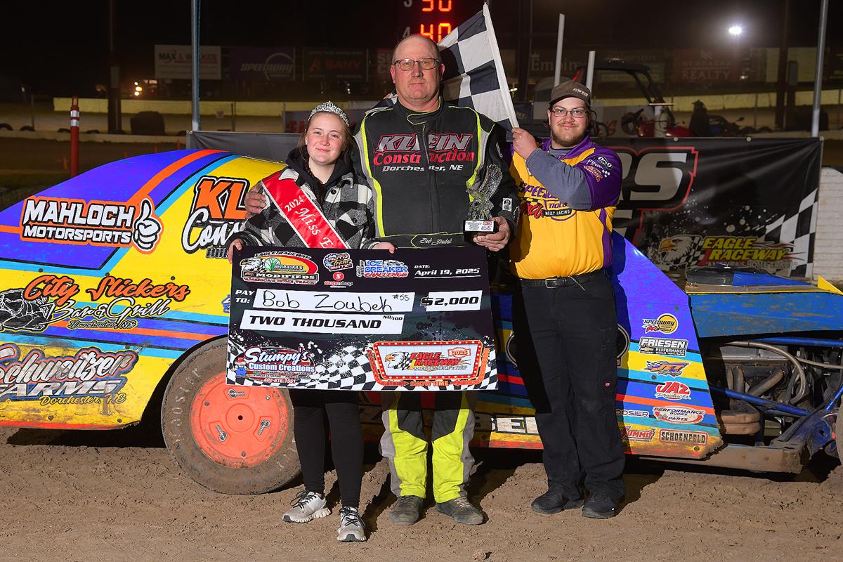 He said “I wouldn’t have bet on myself. I started on the front row, but I pushed on the start and Nate Thompson went by me and had the lead for a while. He ended up hooking a rut and letting me by and I never looked back. I knew that Jordan and Mallicoat were coming but I guess my stuff was good enough to hold them off tonight”. I asked him about the last caution, to which he replied “I didn’t see them, and I had a pretty good rhythm going but then the caution came out. Actually, I thought it was the white flag until I saw the yellow light in the corner. I thought “Damn!”. It is what it is. I’ve lost them that way and won them that way. Today it worked out. One more in the win column. It’s a great way to start off the year after winning the championship last year. So, I’m really happy”. Bob’s sponsors include Mahloch Motorsports, Baker Boys Suspensions, Behrens Family Sweet Corn, City Slickers Bar and Grill, Noonan Industries. Klein Construction, Crist Auto Body, Kohmetscher Roofing, Pracheil Farms and Schweitzer Farms.