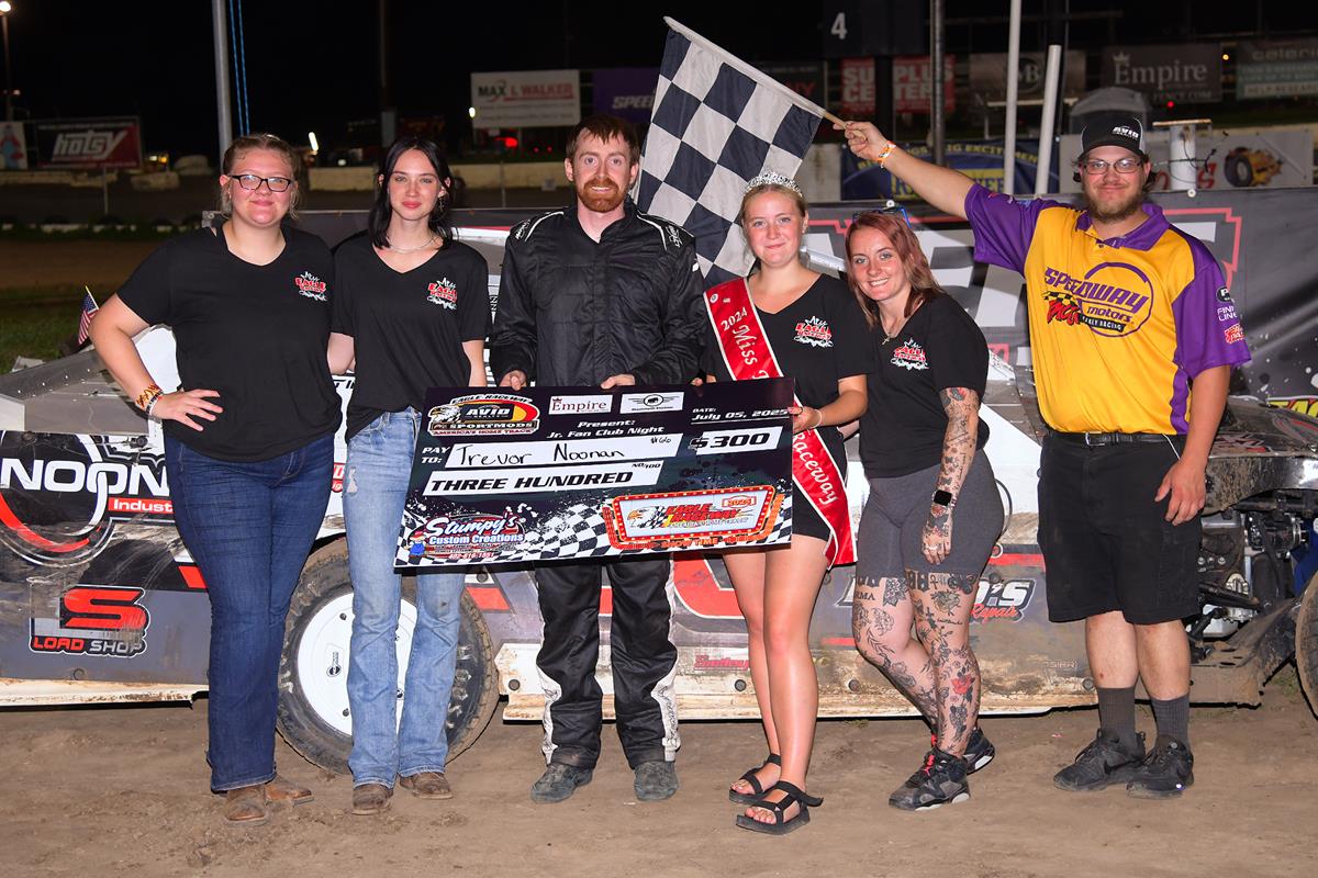 Trevor used to be a regular at Eagle Raceway but this was his first appearance there in 2025 and a triumphant victory marked his return. He said “We just got back from Wisconsin where we were racing at 141 Speedway. We came back and put the car on its lid a couple of weeks ago. We started third tonight and got out to the lead pretty early, so that was easy. I just had to hold off Vrbka and Wayman and all the other fast guys. There was some really hard competition, but that makes it fun racing.” Trevor’s sponsors include Jeremy at Leiting Motorsports, Noonan Industries LLC, Suds N' Scissors, Brodd's Small Engine Repair, D&D Refuse Inc. , Slick Stick Shocks LLC, Underdog Design & Drawing, Performance Bodies, The Load Shop, Midstate Machine, Obdons Meats and Sides, K&L Electric and Slider Chassis.