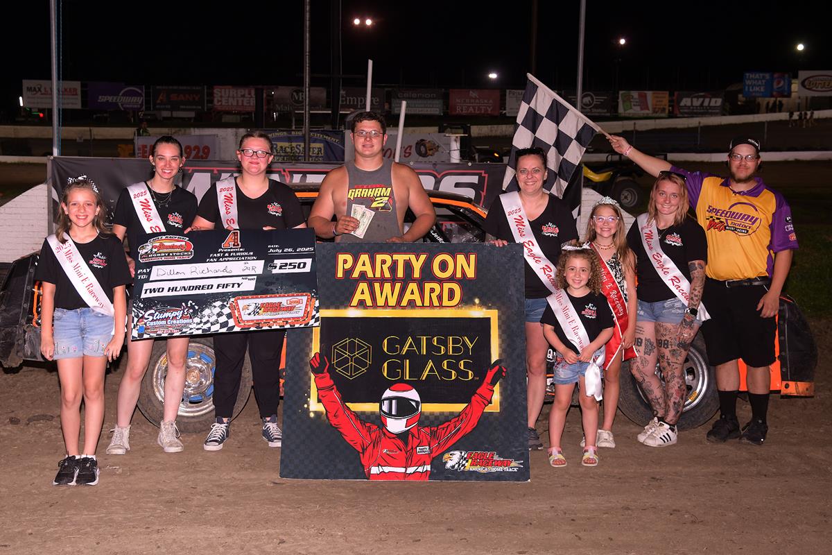 This was Dusty’s first win at Eagle Raceway. He came up from Hebron, Nebraska and said “I think I’ve only been here at Eagle 7 times. Once in a Sportmod back in 2002, a couple of times in a Modified and then this is my fourth time here in a Stock car”. I kidded him that it never hurts to start up front, to which he replied “I’ll take it! It’s a front row hero, but somebody’s got to start there. My car was really good tonight. I got some new shocks from them and they really seemed lights out. I knew to get to the front and try to run away. I’ve only been out a few times this year, so I’m not really in racing condition. First and foremost, I want to thank my wife and my children and my Mom and Dad. They’re my biggest supporters.” Dusty’s sponsors include McMillen Farms, IROC Race Cars, Meyerpold Hereford, Stone Cold Restorations, DSign Shop and Lester Buildings.