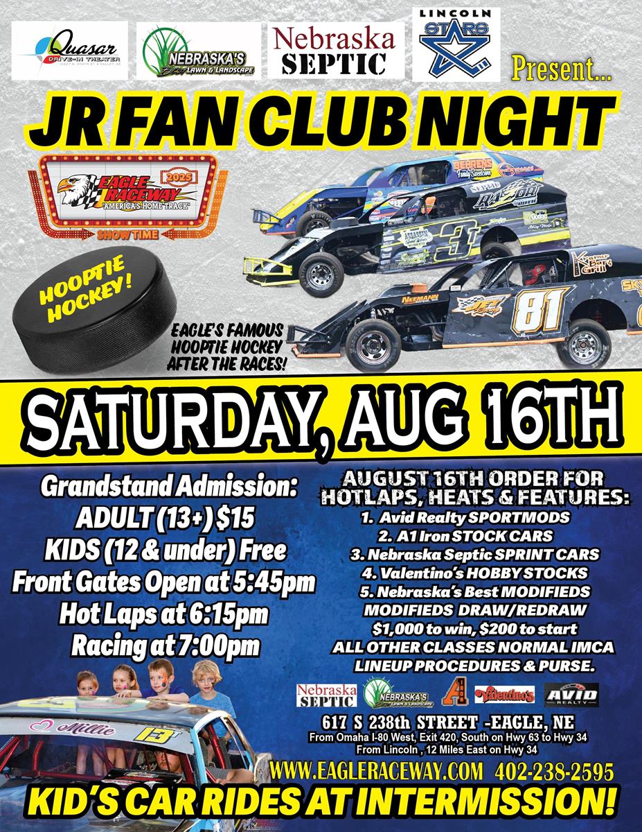 AUG 16th- JR FAN CLUB NIGHT presented by Nebraska's Best, Nebraska Septic, Lincoln Stars & Quasar